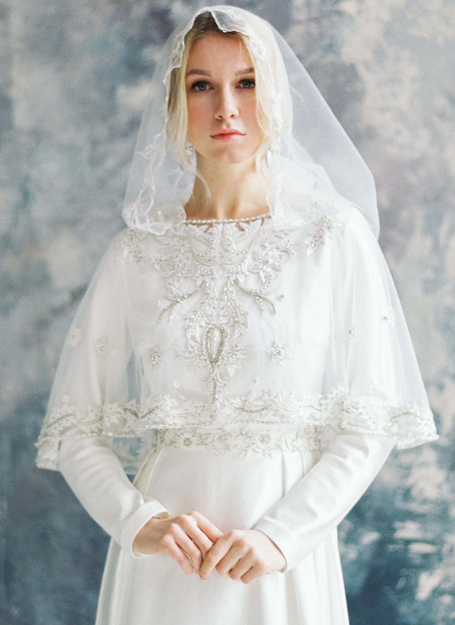 Да, белый, конечно, остается классикой. Но посмотрите в сторону оттенков: цвет топленого молока, шампань, легкий розовый, который называют «пудрой», или даже нежно-лавандовый (да, я серьезно!). На фоне белоснежных стен храма такие оттенки выглядят невероятно живыми и теплыми. Они не спорят с белым цветом платья Богородицы, а скорее дополняют общую картину своим мягким сиянием.