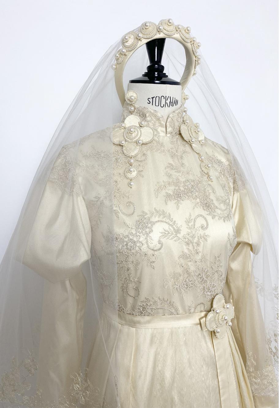 Основа модели выполнена из золотого шёлка, на которую нанесена вышивка ручной работы.