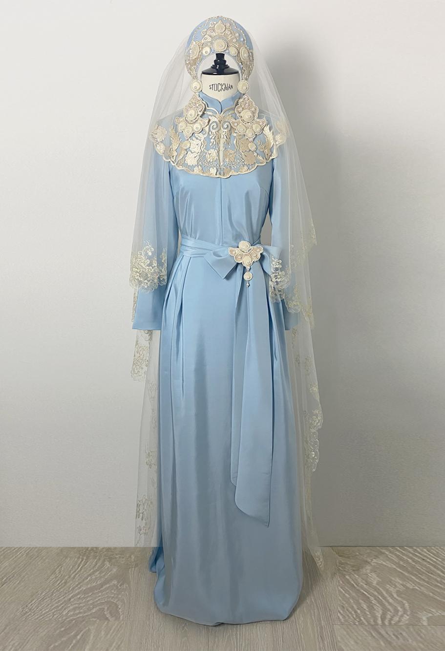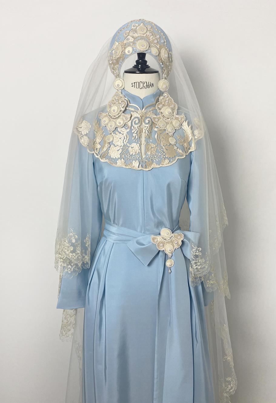 традиционный головной убор в современной интерпретации дизайнера Victoria Spirina, Вышивка на кокошнике гармонично перекликается с узорами на платье, создавая единую художественную картину. Еще одним важнейшим элементом, без которого сложно представить себе целостный свадебный образ в русском стиле, является фата. Она может быть как классической длинной, так и более короткой, современной. Ткань фаты часто украшается той же ручной вышивкой или же delicate кружевом, что и основное платье, что создает эффект перетекания одного элемента в другой, полной гармонии и цельности. Когда невеста движется, фата и шелк платья колышутся в унисон, создавая ощущение движения и жизни.