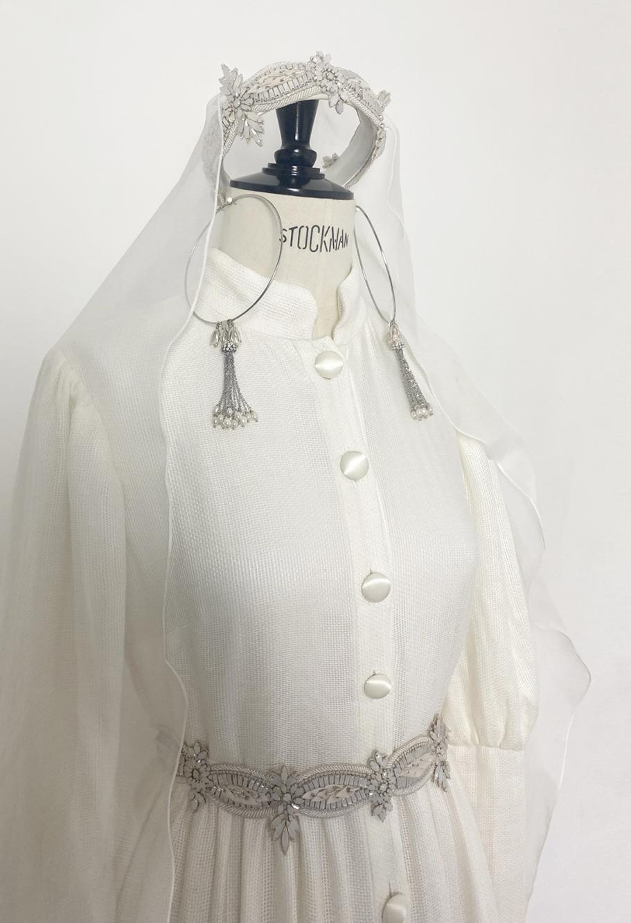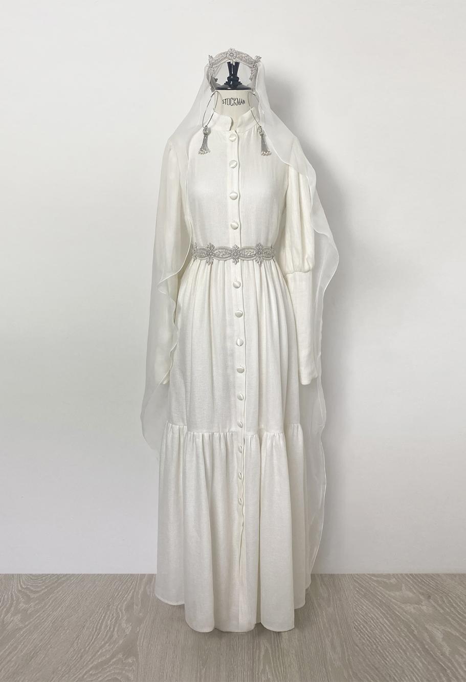 Теплый молочный оттенок, символизирующий чистоту и благодать, создает изысканный контраст с натуральной текстурой ткани, напоминающей о наследии народных ремесел.