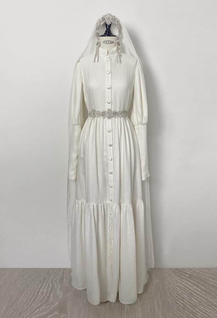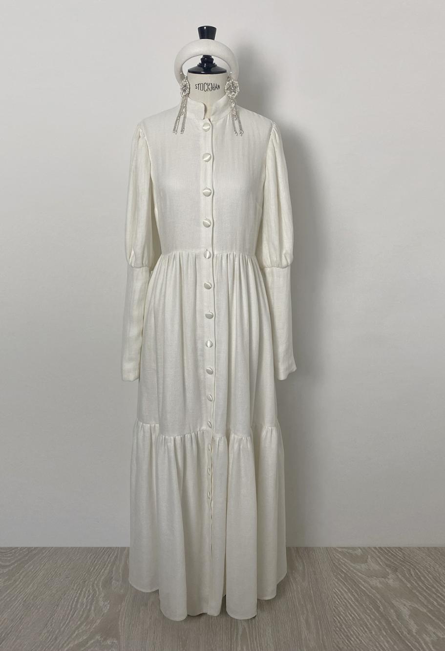 Пышные рукава, ниспадающие мягкими складками, и стройный ряд пуговиц по переду, придают наряду царственное величие.
