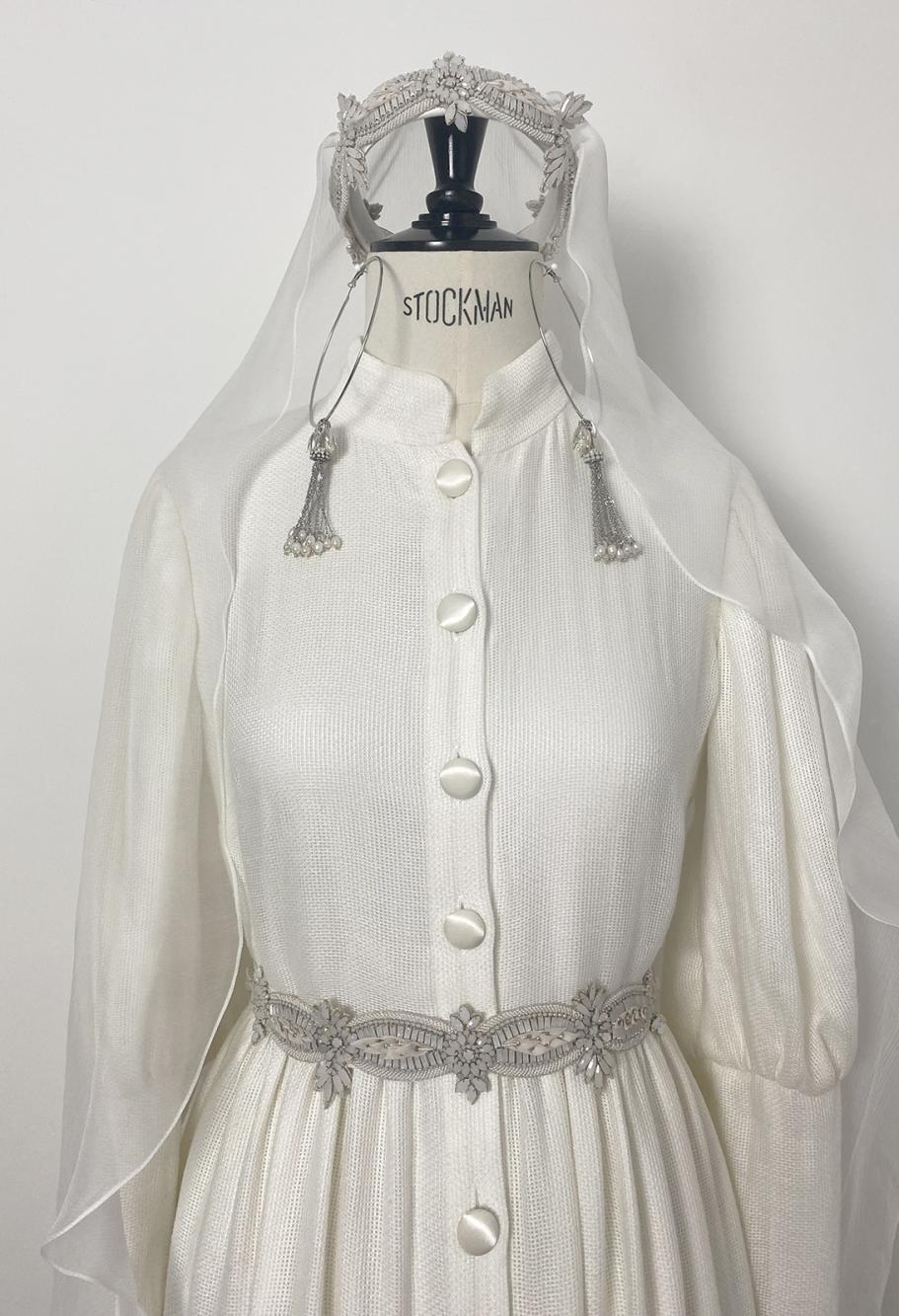 Длинный, идеально скроенный рукав добавляет образу торжественности и величия, мягко ниспадая изящными складками и визуально вытягивая линию рук.