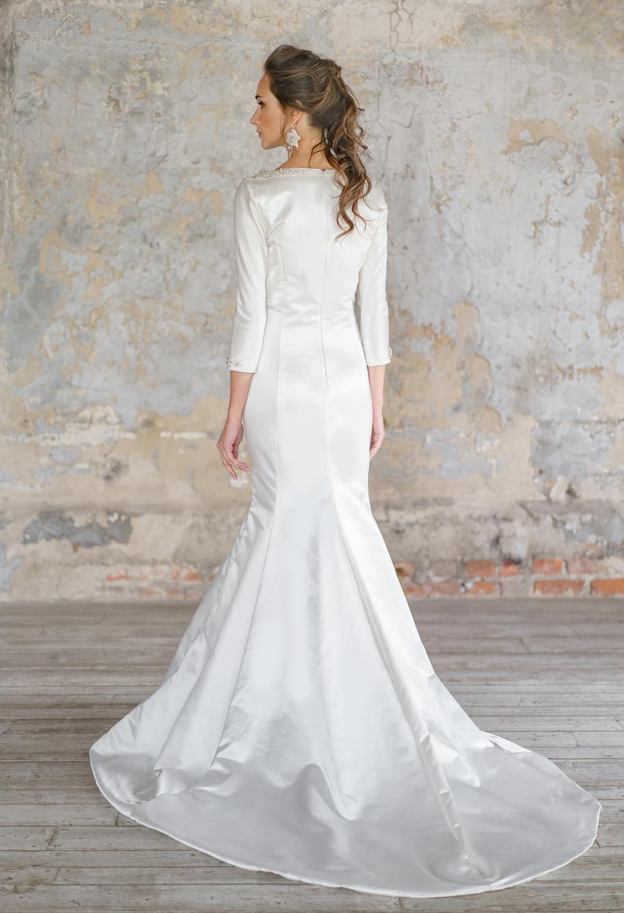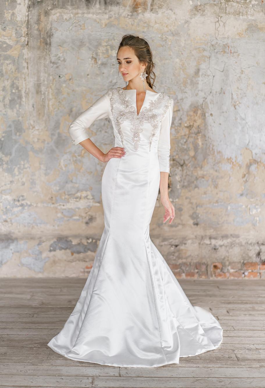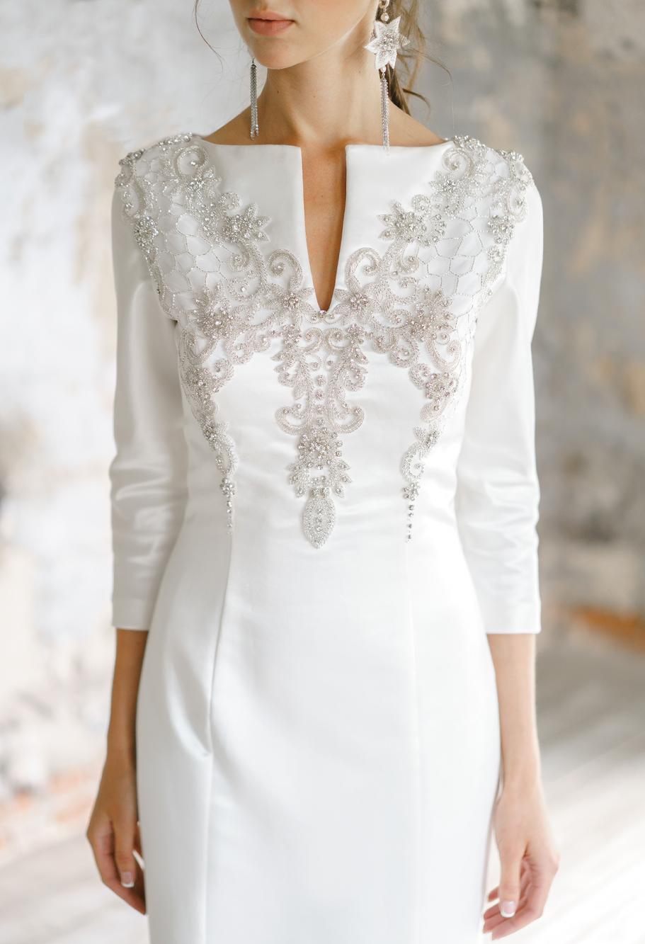 описание: Роскошное свадебное платье из натурального шёлка и вышивки. Платье силуэтное с рукавами 3/4. Свадебное платье рыбка с рукавами.