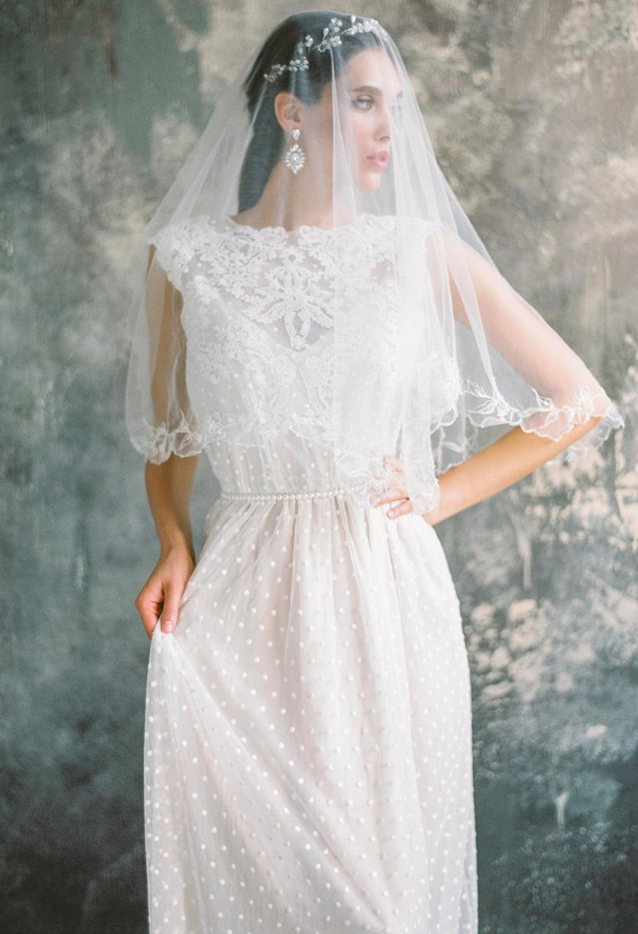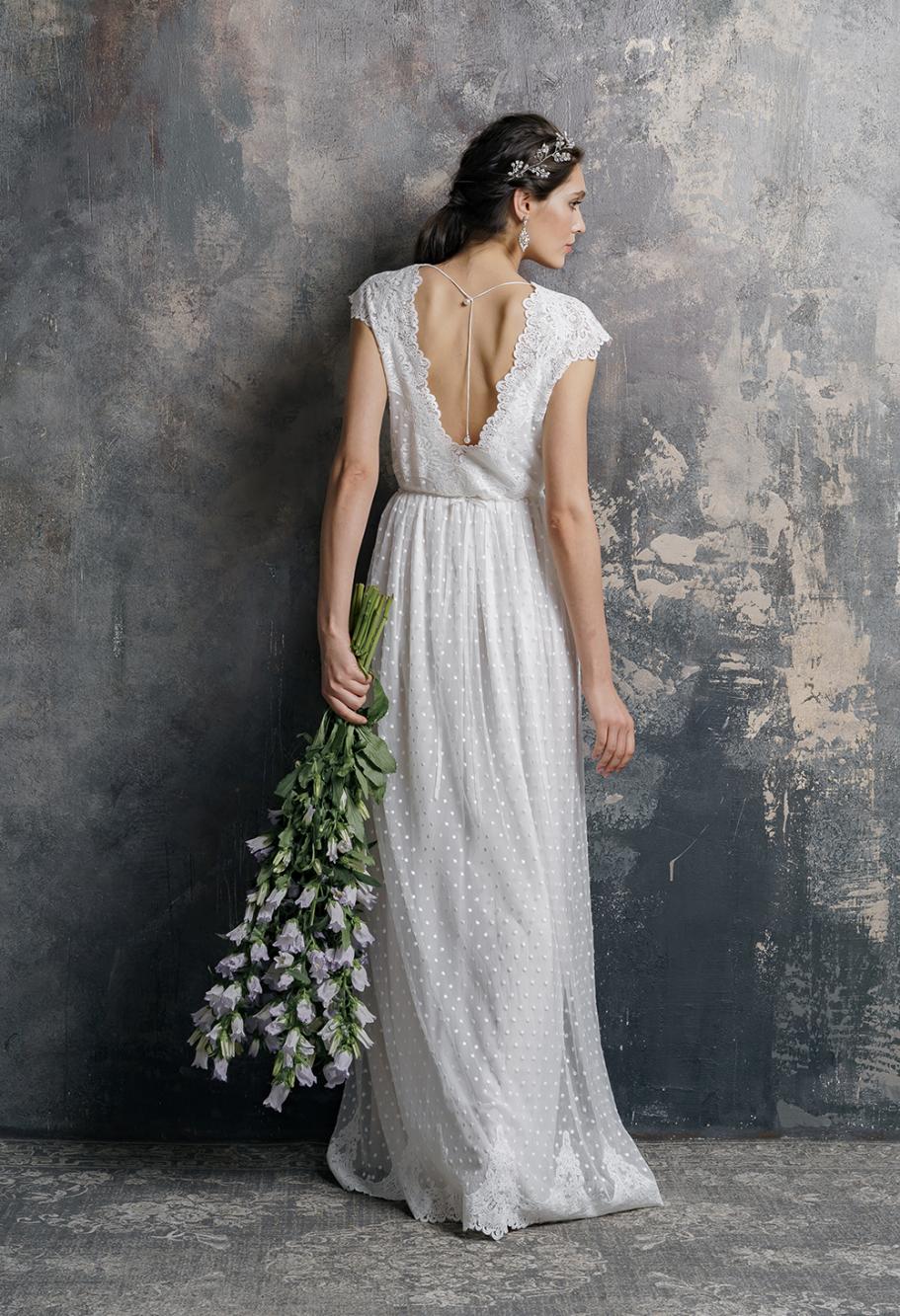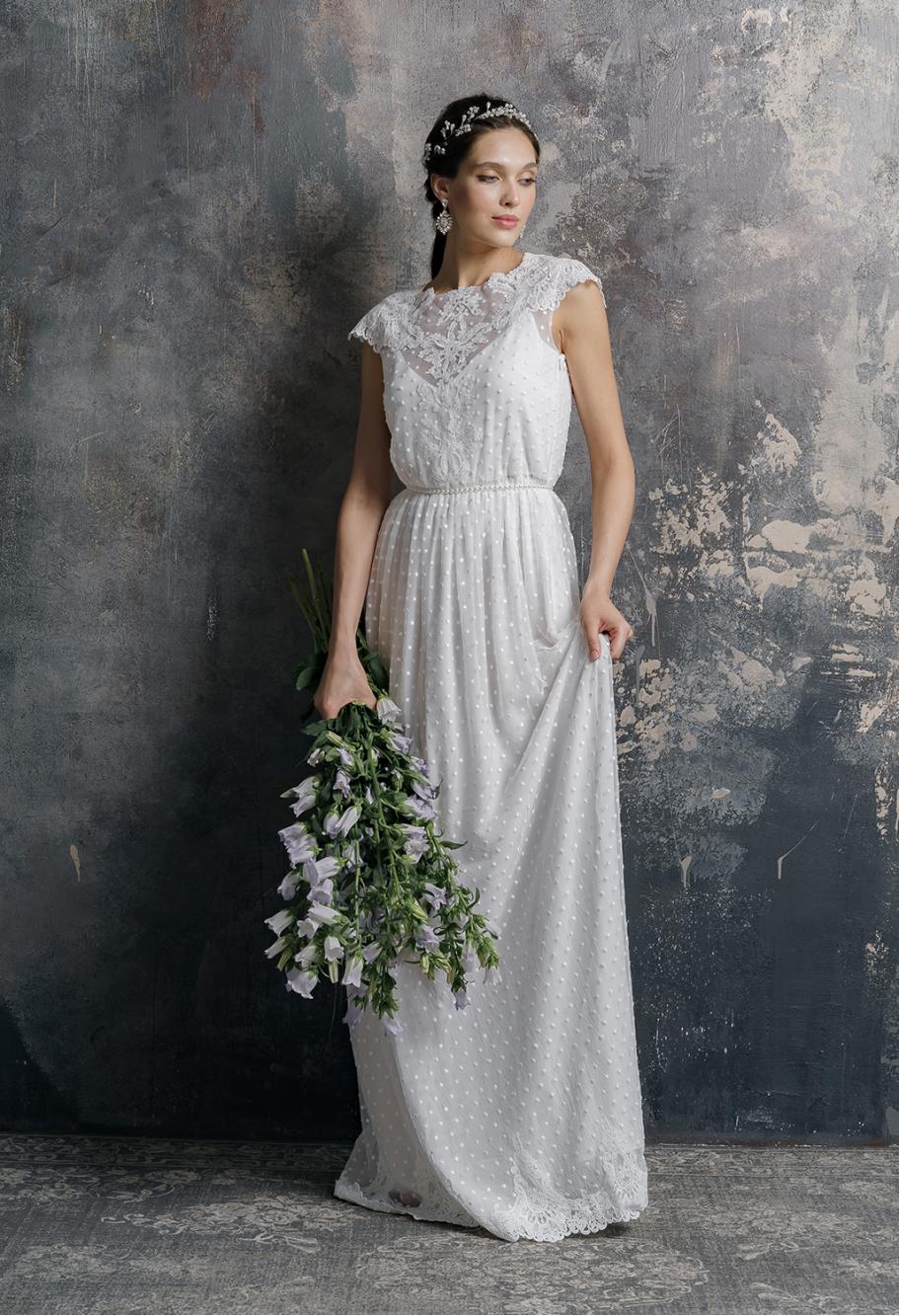описание: Нежное свадебное платье прямого кроя в горошек, с v- вырезом на спине.