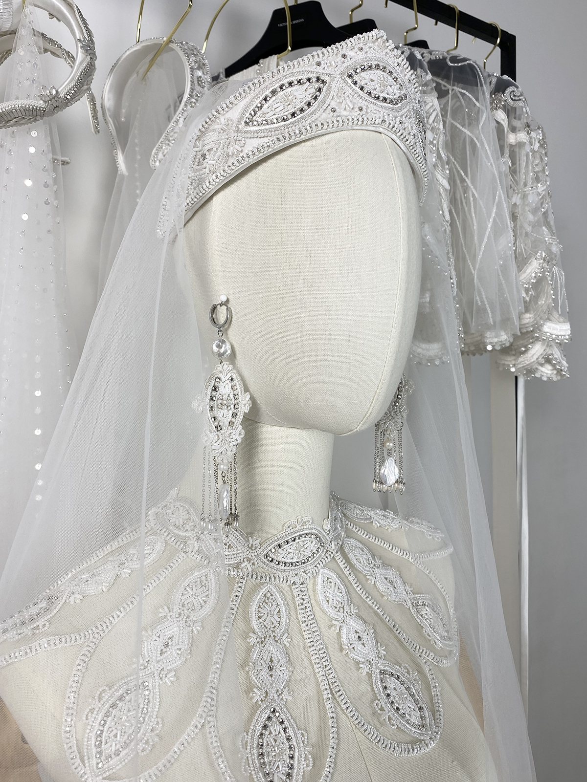 "Город" — невысокие, асимметричные формы. Кокошник здесь скорее угадывается, чем читается прямо. Это для невест, которые хотят отсылку, а не цитату. Носится с гладкими платьями-футлярами, атласными костюмами, минималистичными силуэтами.